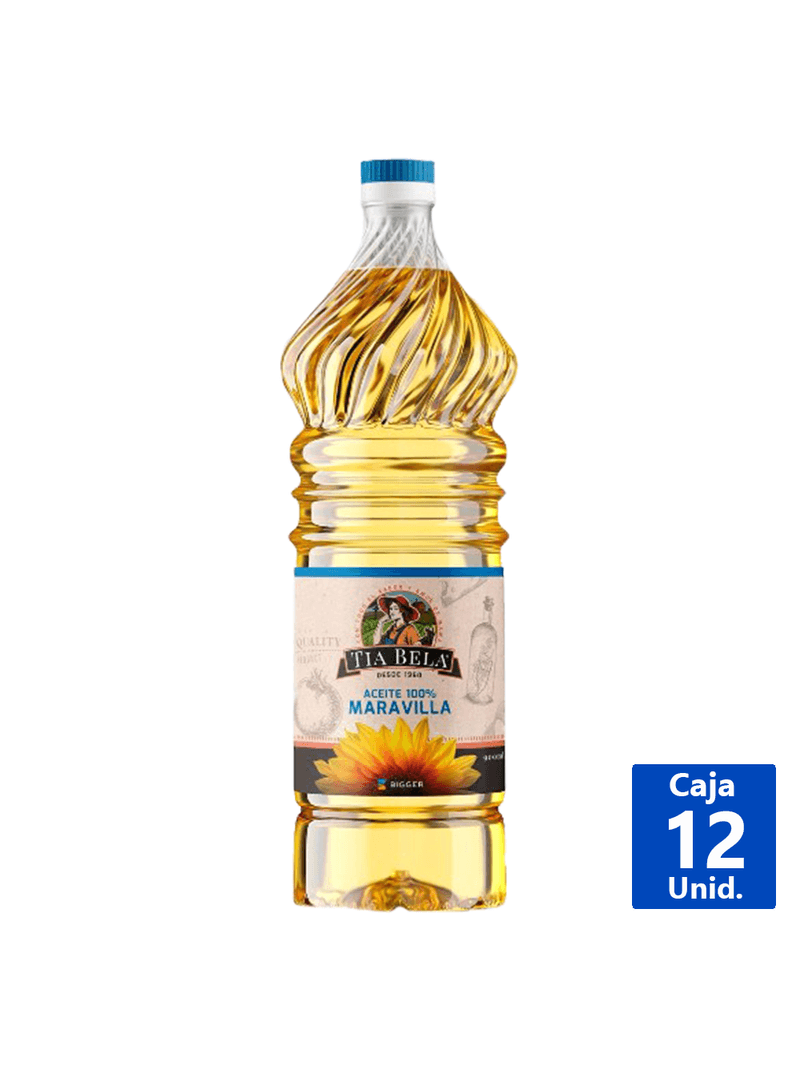 Aceite de maravilla Tía Bela, versátil y de gran rendimiento en la cocina. Su formato de 900 ml es práctico para el hogar y negocios. Pack de 12 unidades que asegura stock y conveniencia.