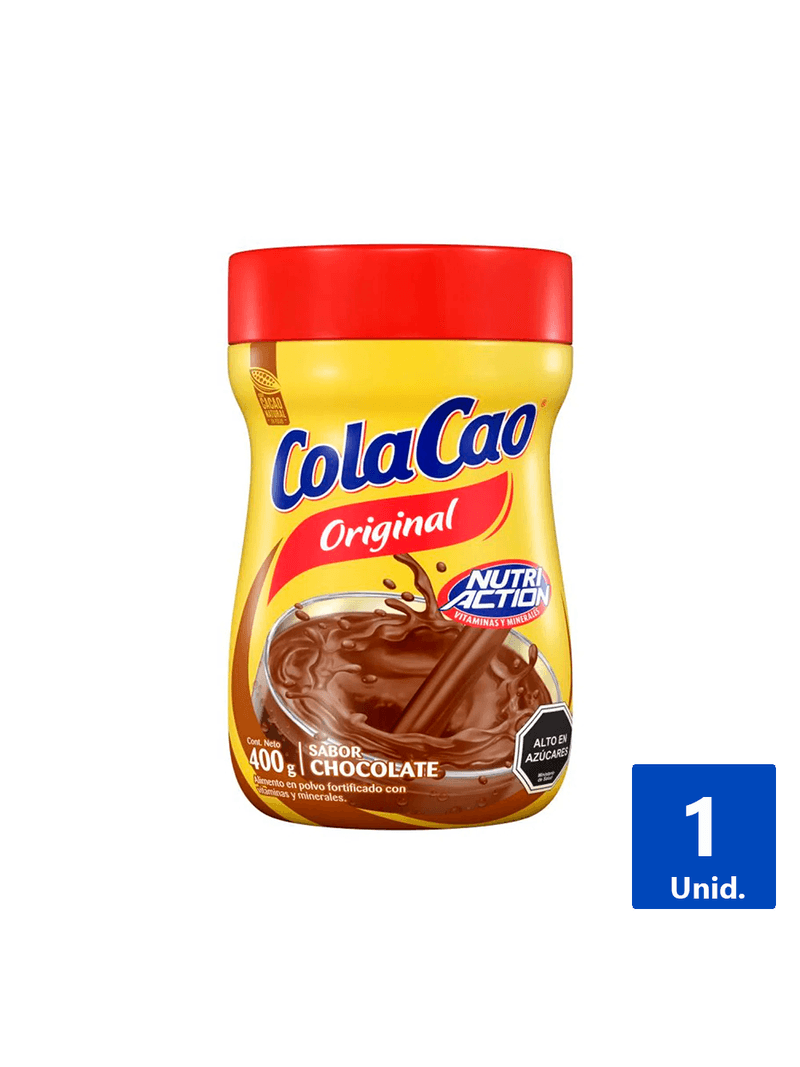 Alimento en polvo instantáneo de Cola Cao, fortificado con vitaminas y minerales. Versión Chocolate Original.