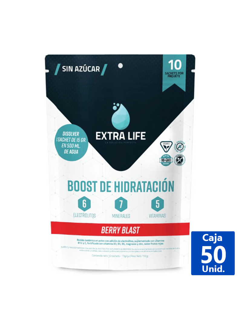 Extra Life es una bebida isotónica en polvo en formato sachet, con más de 1393 mg de electrolitos, vitaminas y minerales creada para combatir los efectos de la deshidratación y ayudarte con tu recuperación.