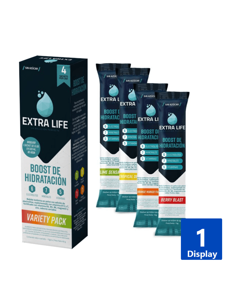 Pack de bebidas isotónicas en polvo Extra Life Boost para una hidratación efectiva. Incluye 4 sobres de 15 g con sabores variados, ideal para reponer electrolitos después del ejercicio o jornadas intensas.