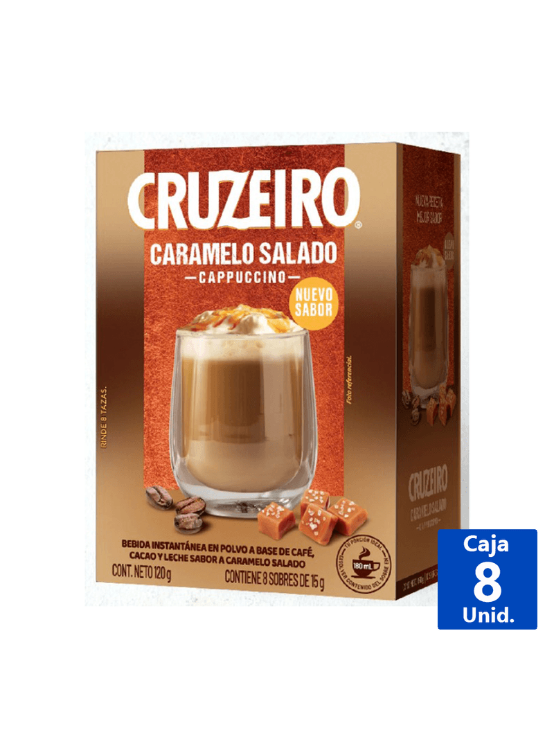 Disfruta de un delicioso café cappuccino sabor caramelo salado con Café Cruzeiro. Este producto viene en un práctico formato de 10 sobres de 15g cada uno, perfecto para disfrutar en cualquier momento del día.