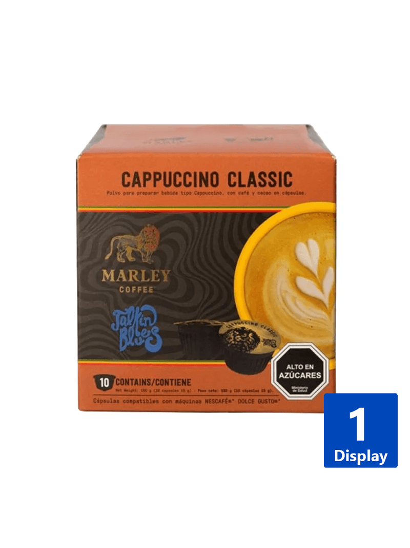 Disfruta un cremoso Cappuccino con Café Cápsulas Marley Coffe Talkin Blues 10 un. Sabor intenso y espuma perfecta en tu taza. ¡Tu momento de indulgencia al instante, compatible con Nespresso!
