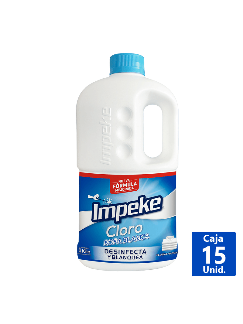 Descripción: Cloro Líquido Ropa Blanca 1Kg. de Hipoclorito de Sodio al 2,62% Sku 3002900 / 10252591. Beneficios: Máxima desinfección y limpieza. Elimina y previene el desarrollo de gérmenes, bacterias y hongos. Mata el Covid 19, Sars Cov 2. Elimina manchas y suciedad rebelde. Producto totalmente soluble y de fácil enjuague en agua fría o caliente. Instrucciones de Uso Para lavado de ropa y desinfección de superficies no porosas. Seguir instrucciones indicadas en el envase. Importante No utilizar para desinfectar alimentos ni potabilizar agua. Mantener fuera del alcance de los niños. No almacenar junto con los alimentos. No mezclar con otros productos químicos. Vida Útil 12 meses a partir de la fecha de elaboración Almacenamiento Conservar en su envase original, bien cerrado y alejado de fuentes de calor. ¡Siente la confianza de un hogar impecable, brillante y seguro con Cloros Impeke!