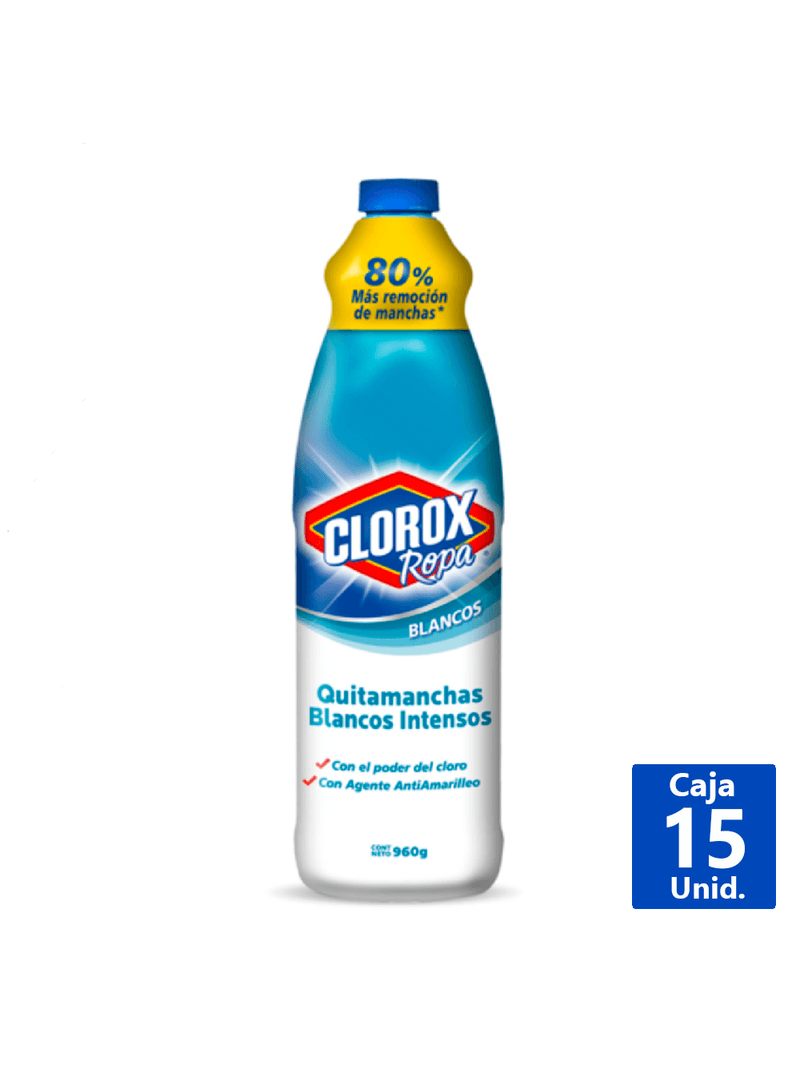 El Quitamanchas Blancos Intensos Ropa Blanca de Clorox, es un cloro especialmente desarrollado para el lavado de la ropa. Su fórmulacon agente anti amarilleo, deja tu ropa 2 veces más blanca, removiendo las manchas, como por ejemplo las de salsa de tomate, vino ycafé. Agente amarilleo: es un cloro especialmente desarrollado para el lavado de la ropa. Su fórmula mantiene aisladas las partículaas metálicas del agua, dejando tu ropa 2 veces más blanca.