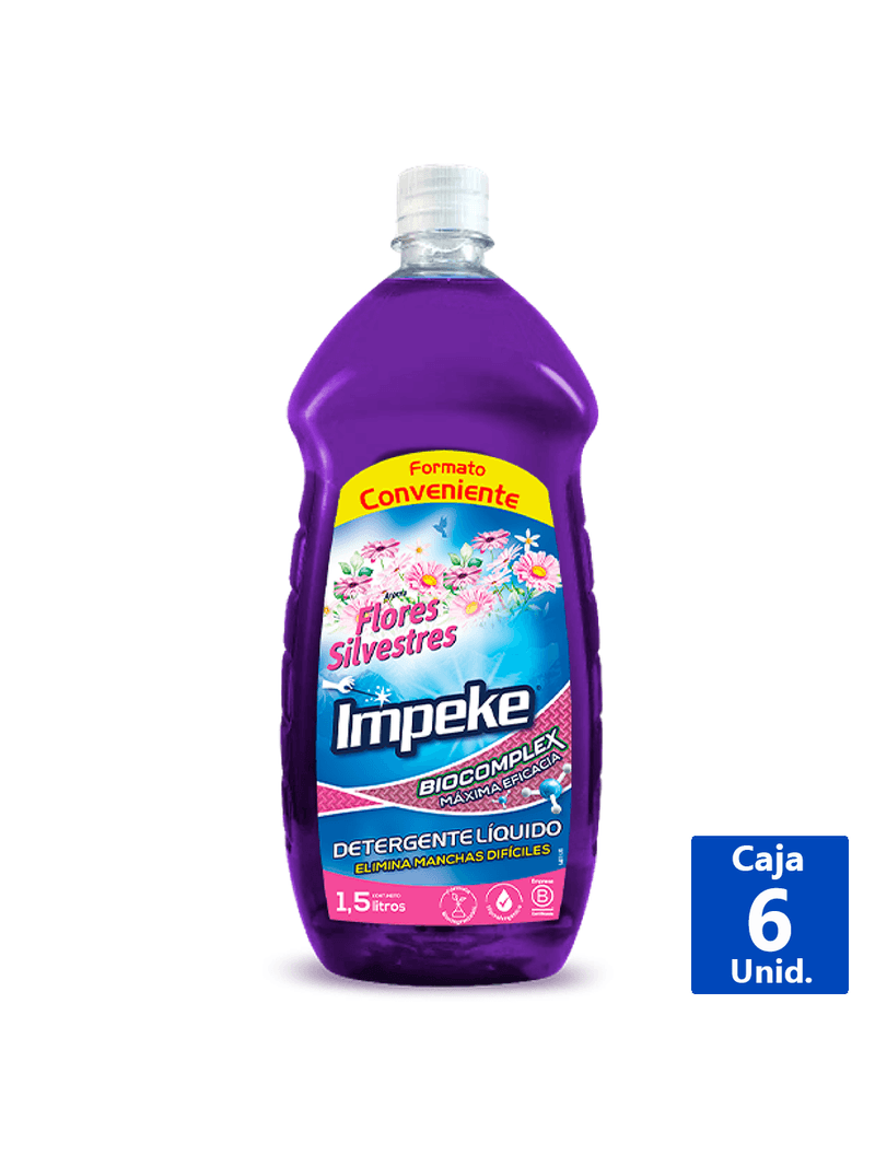 Descripción: Detergente Líquido con fórmula biodegradable certificada por el Dictuc, Aroma Flores Silvestres 1,5 Lts. Sku 1102173 / 10258882 Beneficios: Disminuye el impacto en el ecosistema. Eficaz ante manchas difíciles. Eficiente en aguas duras. Instrucciones de Uso Lavado a máquina carga frontal o superior. Para mayor información leer instrucciones de uso en la etiqueta. Vida Útil 24 meses a partir de la fecha de elaboración. Almacenamiento Mantener bien cerrado en lugar fresco y seco. No exponer a temperaturas inferiores a 3°C Importante Mantener fuera del alcance de los niños. ¡Siente la confianza de un hogar impecable, brillante y seguro con Detergente Impeke!