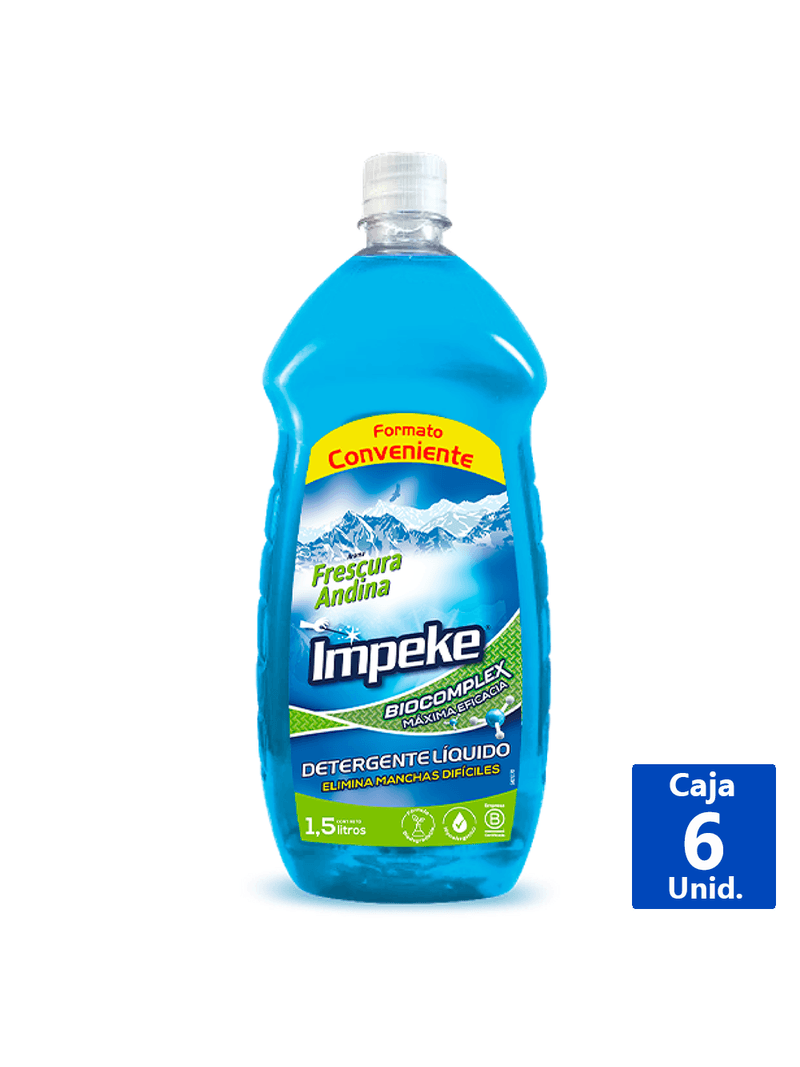 Descripción: Detergente Líquido con fórmula biodegradable certificada por el Dictuc, Aroma Frescura Andina 1,5 Lts. Sku 1102172 / 10258876 Beneficios: Disminuye el impacto en el ecosistema. Eficaz ante manchas difíciles. Eficiente en aguas duras. Instrucciones de Uso Lavado a máquina carga frontal o superior. Para mayor información leer instrucciones de uso en la etiqueta. Vida Útil 24 meses a partir de la fecha de elaboración. Almacenamiento Mantener bien cerrado en lugar fresco y seco. No exponer a temperaturas inferiores a 3°C Importante Mantener fuera del alcance de los niños. ¡Siente la confianza de un hogar impecable, brillante y seguro con Detergente Impeke!