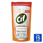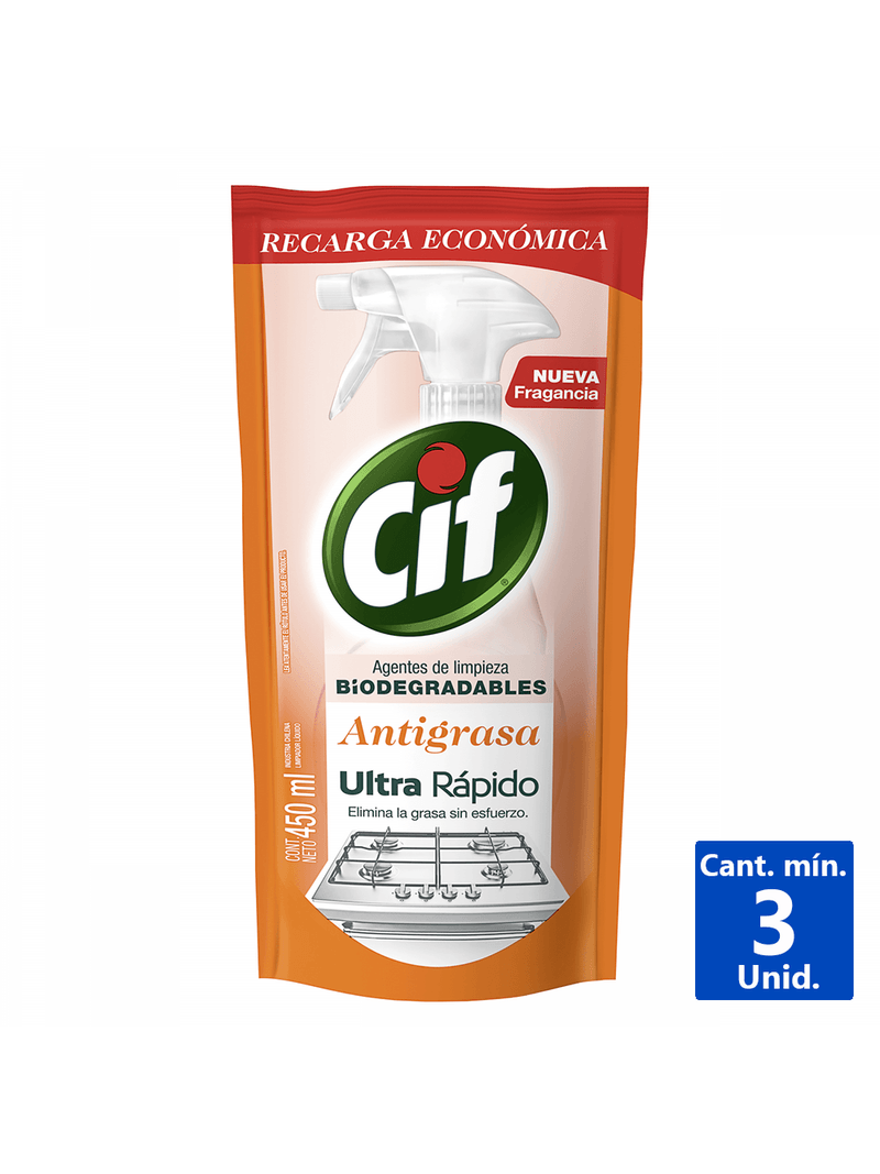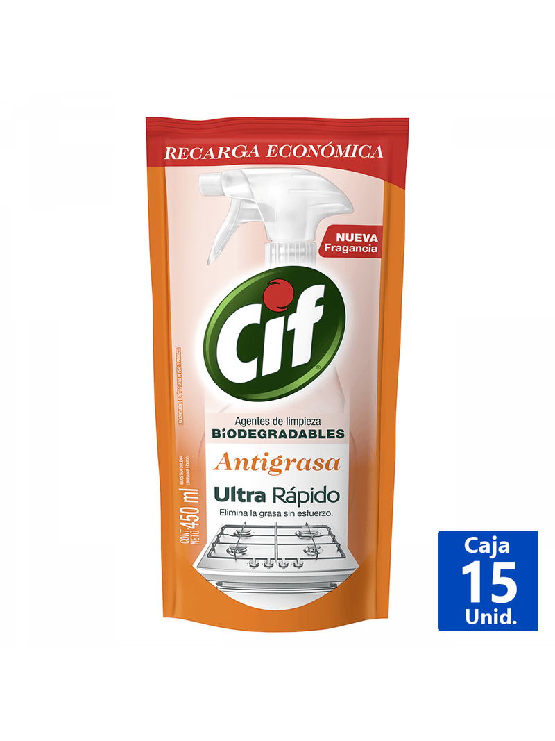 Cif Limpiador Antigrasa Biodegradable es un limpiador líquido que con su tecnología y su nueva fórmula con materia activa biodegradale brinda una limpieza fácil con el cual obtienes el doble de eficiencia con la mitad de esfuerzo. Cif Antigrasa ayuda a eliminar rápidamente hasta la suciedad más difícil en 10 segundos. Las manchas de grasa no son un problema cuando existen productos desengrasantes especialmente formulados como Cif Limpiador Antigrasa. La poderosa fórmula de Cif Antigrasa elimina fácil y rápidamente la suciedad dejando las superficies brillantes, como nuevas. Algunas de las superficies que se pueden limpiar son mesada, mesón de cocina, hhornallas, anafes, extractor, azulejos, superficies de acero inoxidable, microondas, refrigerador, electrodomésticos.