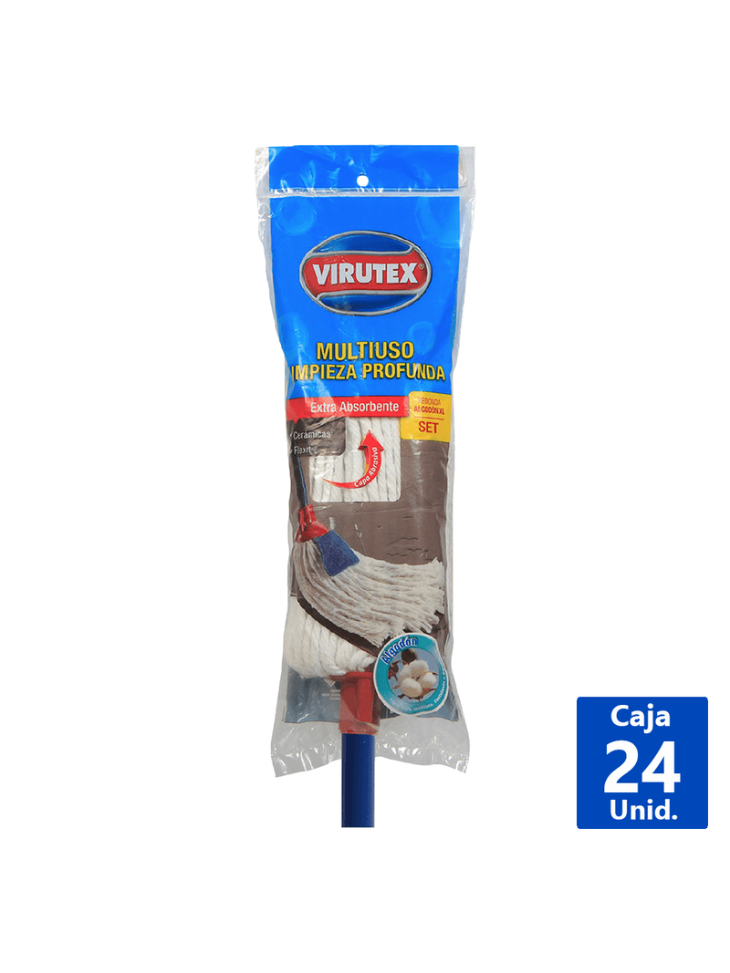 Descripción: Set Mopa Algodón clásica, 165 grs. Cabo metálico 0,28mm recubierto azul. Rosca Italiana. Sku 1201495 / 10258812 Beneficios: Apta para todas las superficies del hogar. Gran capacidad de absorción y resistencia al limpiar o secar. Instrucciones de Uso Para un mejor resultado, remojar en agua caliente antes del primer uso. Temperatura de lavado 30°C. ¡Es el momento de redescubrir el placer de un piso impecable con la calidad que solo Virutex puede ofrecer!