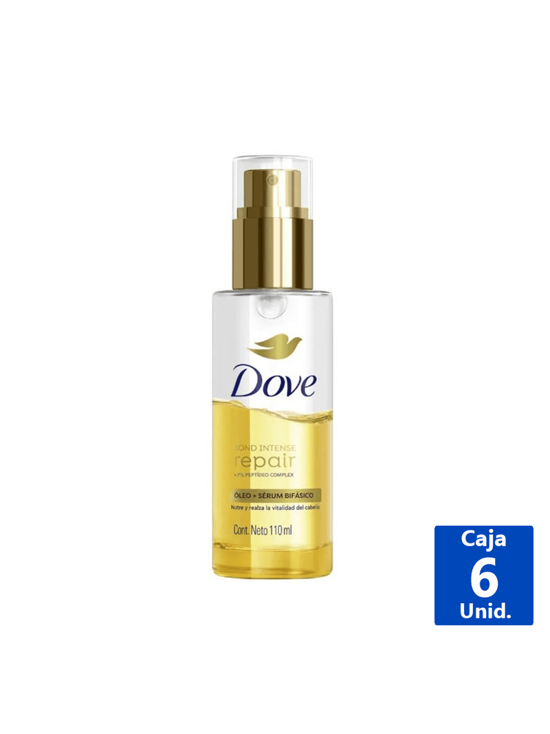 Nuevo Óleo + Sérum Bifásico Dove Bond Intense Repair + 7% Péptido Complex. Nutre Y Realza La Vitalidad Del Cabello Y Disfruta Los Beneficios Nutritivos Y Transformadores. Con Bio-Protein Caretm + 7% Péptido Complex, Tecnologia Exclusiva Compatible Con Tu Fibra Natural. Penetra Y Trabaja En Armonía Con La Biologia Natural Del Cabello Para Reparar Las Señales De Daño, Hasta Las Más Extremas. Cabello 4X Más Suave Reduce 91% Las Puntas Abiertas Controla El Frizz Hasta Por 72 Horas Brillo Extra Por 48 Horas Textura Ultraliviana De Rápida Absorción Protección Continua De Los Enlaces Capilares Realza El Color Protección Térmica Nutre Y Devuelve El Movimiento Natural Blindaje Anti-Humedad