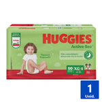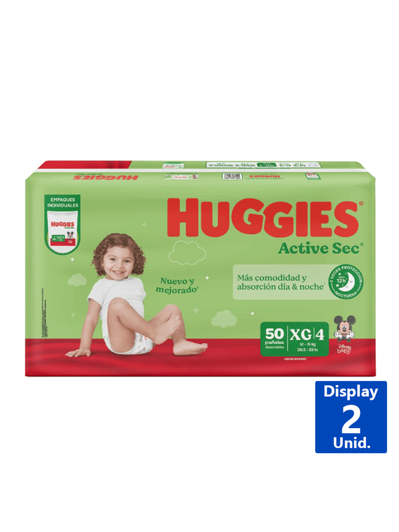 Los pañales desechables para bebe Huggies Active Sec nuevo y mejorado, ofrecen más comodidad y absorción durante la noche, siendo dos veces más protección, cuentan con nuevo centro azul para más absorción. Posee cintura, orejas y barreras elásticas para el ajuste del pañal al cuerpo del bebé: es único con canales que se adaptan a los movimientos. Además posee indicador en el área frontal del pañal que muestran el momento de cambiar de talla.