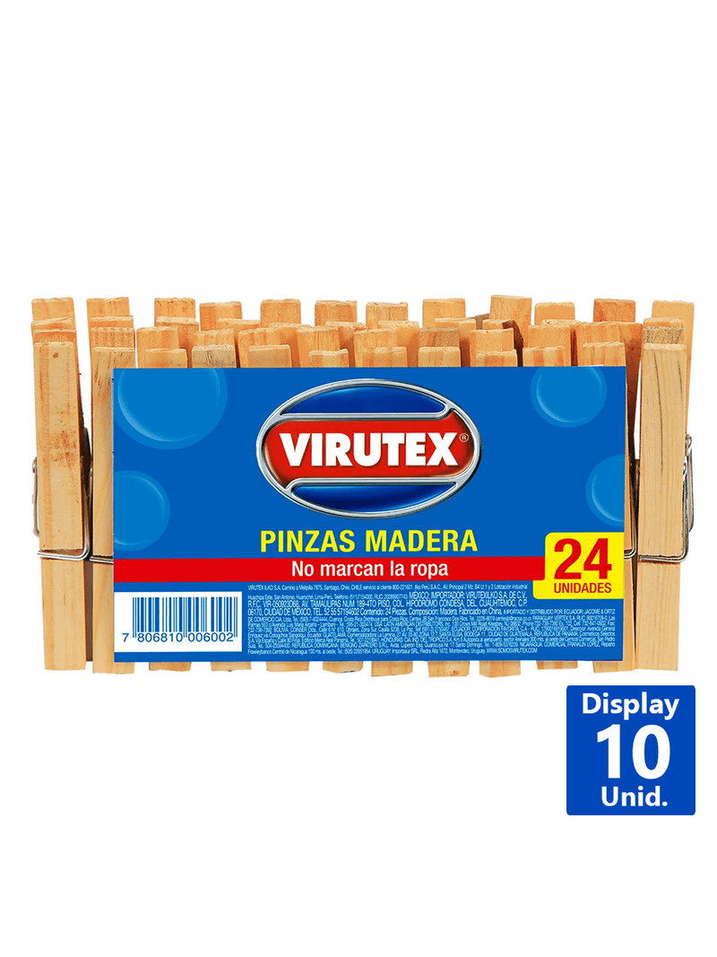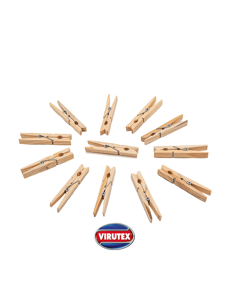 Descripción: Pack de 24 Pinzas de Madera Natural para ropa con resorte de acero inoxidable. Sku 1100600 / 10106571 Beneficios: Ideal para colgar ropa mojada con agarre seguro. Diseñado para no marcar la ropa. Instrucciones de Uso Utilizar bajo la sombra para mayor durabilidad. ¡Cuelga tus prendas con la delicadeza y seguridad que se merecen con Virutex!