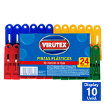 Descripción: Pack de 24 Pinzas plásticas para ropa de colores rojo, azul, amarillo y verde. Sku 1100630 / 10106572 Beneficios: Resistente gracias a su gancho de presión de larga duración. Ideal para colgar ropa mojada. Diseñado para no marcar la ropa. Instrucciones de Uso Utilizar bajo la sombra para mayor durabilidad. ¡Cuelga tus prendas con la delicadeza y seguridad que se merecen con Virutex!
