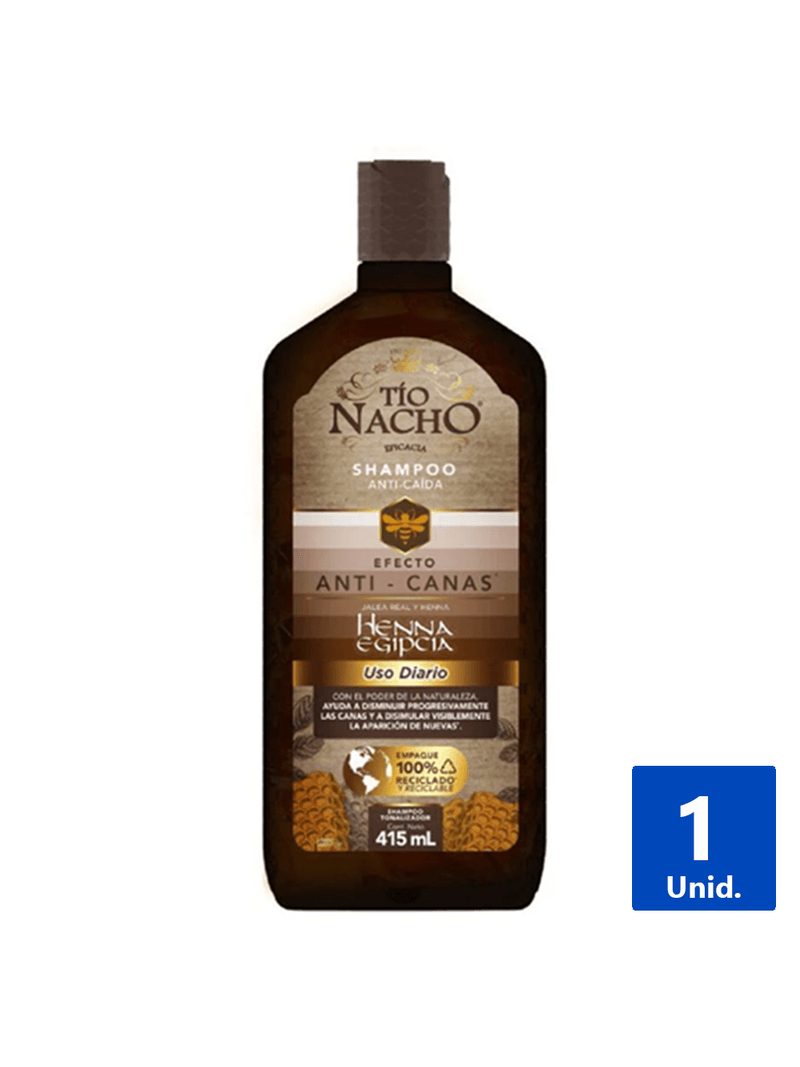 Reduce las canas progresivamente con el Shampoo Tío Nacho Efecto Anti- Canas de 415 ml. Su fórmula natural nutre y fortalece tu cabello, devolviéndole un aspecto más joven y vibrante. ¡Para un pelo con vida!