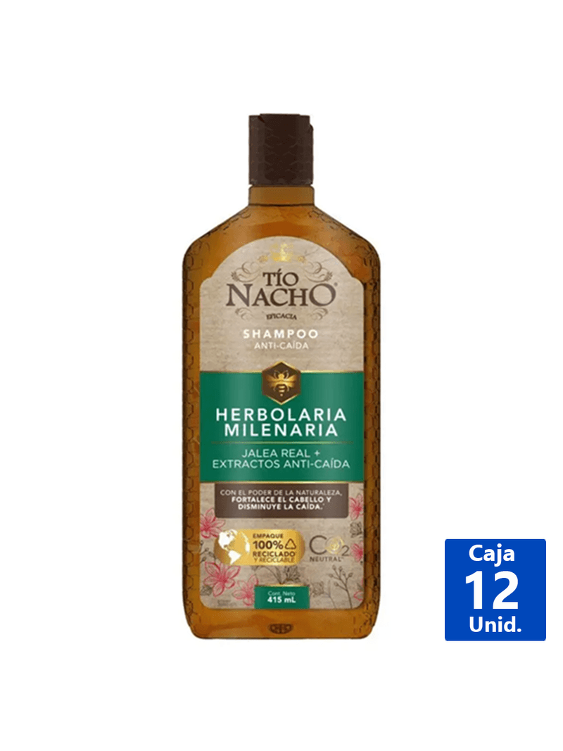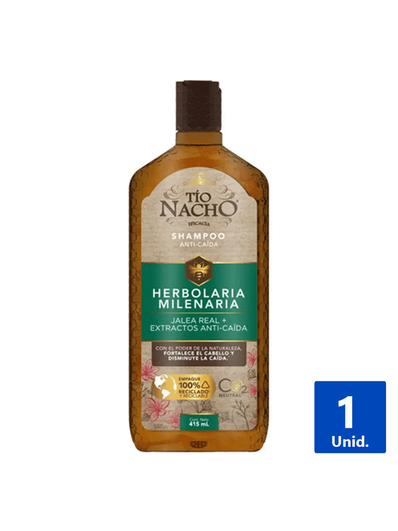 El Shampoo Tío Nacho Herbolaria Milenaria con jalea real combina una serie de ingredientes de extractos naturales con propiedades que nutren la raíz del pelo, limpian en profundidad el folículo y ayudan a eliminar el exceso de sebo del cuero cabelludo. Al mismo tiempo, estimulan el crecimiento y revitalizan el cabello frágil y en situación de caída. Herbolaria Milenaria con jalea real, extracto de chile, agave, jitomate, cacahuananche, romero y aloe vera. La selección de los ingredientes más poderosos de la naturaleza que fortalecerán tu cabello hebra por hebra.