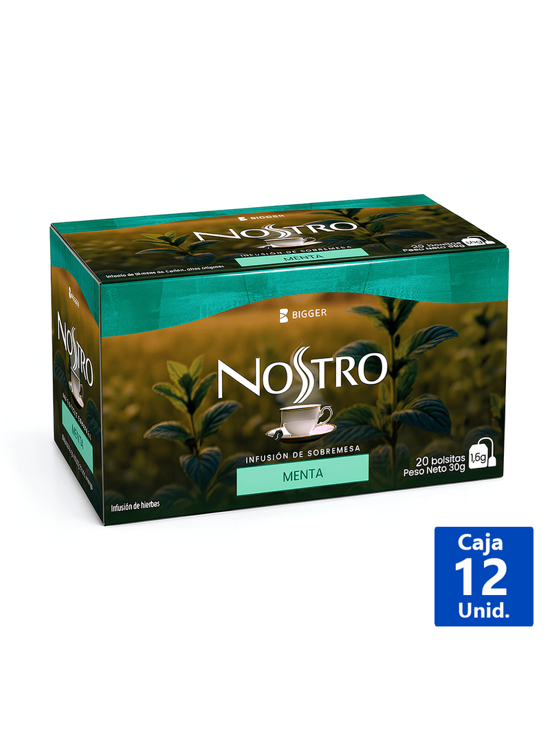 Infusión de Menta Nostro en formato de 20 bolsitas, con un perfil refrescante y aroma intenso característico de la menta. Ideal para disfrutar caliente o como bebida reconfortante después de las comidas. Pack de 12 unidades pensado para almacenes, cafeterías y negocios que buscan ampliar su oferta de infusiones.