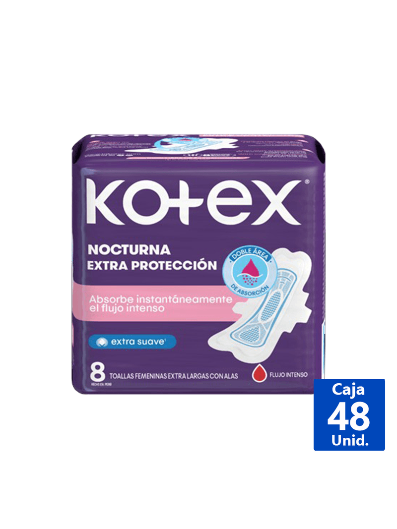 Kotex Normal Nocturna Tela con doble área de absorción en el centro y atrás para mayor seguridad. Captura el flujo distribuyéndolo a lo largo de la toalla previniendo filtraciones. Con cubierta extra suave para mayor comodidad.